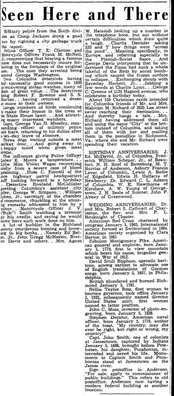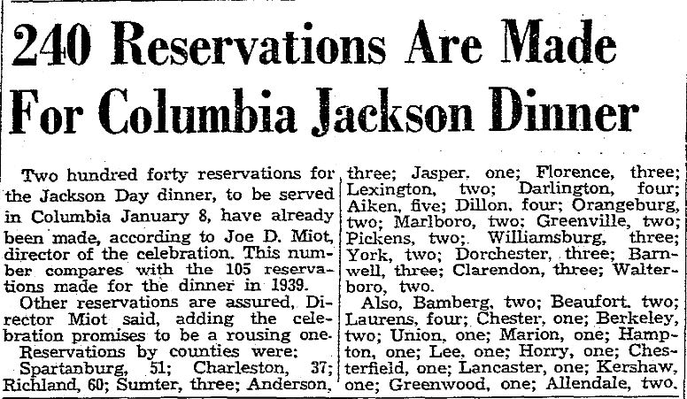 Two hundred forty reservation for the Jackson Day dinner, to be serve in Columbia January 8, have already been made, according to Joe D. Miot, director of the celebration. This number compares with the 105 reservation made for the dinner in 1939. Other reservation are assured, Direct Miot Said, adding the celebration promises to be a rousing one. Reservation by counties were: Spartanburg, 51; Charleston, … Continue reading 240 Reservation Are Made For Columbia Jackson Dinner