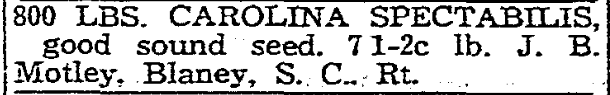 Today in History800 LBS. CAROLINA SPECTABILIS 800 LBS. CAROLINA SPECTABILIS, good sound seed, 71-2c lb. J. B. Motley, Blaney, SC Rt. February 22, 1940 State (published as The State) Columbia, South Carolina Page 12