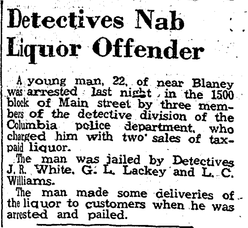 A young man, 22, of near Blaney was arrested last night in the 1500 block of Main street by three members of the detective division of the Columbia police department, who charged him with two sales of tax-paid liquor.