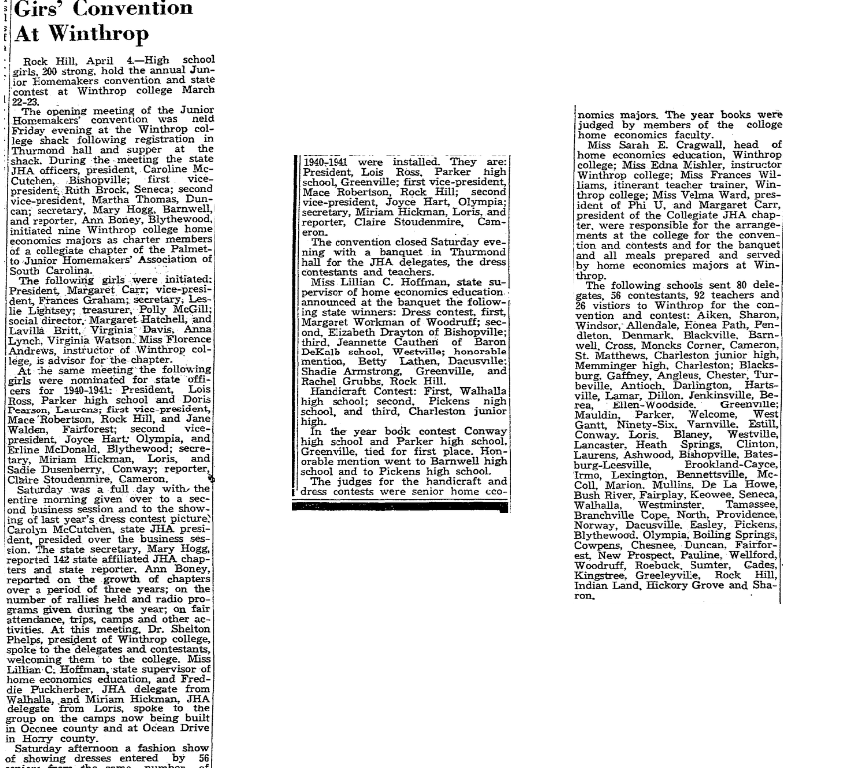 At the same meeting the following girls were nominated for state officers for 1940 – 1941; President, Lois Ross, Parker High school and Doris Pearson, Laurens; first vice-president, Mace Robertson, Rock Hill, and Jane Walden, Fairforest; second vice president, Joyce Hart; Olympia, and Erline McDonald, Blythewood; secretary, Miriam Hickman, Loris, and Saide Dusenbery, Conway: reporter, Claire Stoudenmire, Cameron.