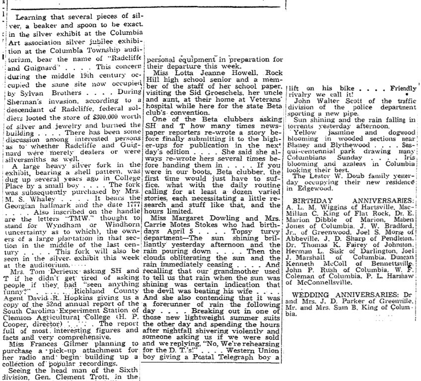 Learning that several Pieces of silver, a beaker and a spoon to be exact, in the silver exhibit at the Columbia Art association silver jubilee exhibition at the Columbia Township auditorium, bear the name of “Radcliffe and Guignard” . . . . This concern during the middle 19th century occupied the same site now occupied by Sylvan Brothers . . . . During Sherman’s invasion, according to a descendant of Radcliffe, federal soldiers looted the store of $300,000 worth of silver and jewelry and burned the building . . . . There has been some discussion among interested persons as to whether Radcliffe and Guignard were merely dealers or were silversmiths as well.