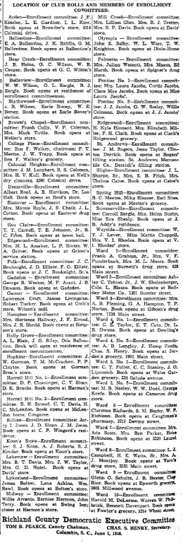 Ward 6 – Enrollment committee: Clarence Richards, S. M. Busby, W. P. Etchison. Book opens at Caughman’s pharmacy, 2717 Devine street.