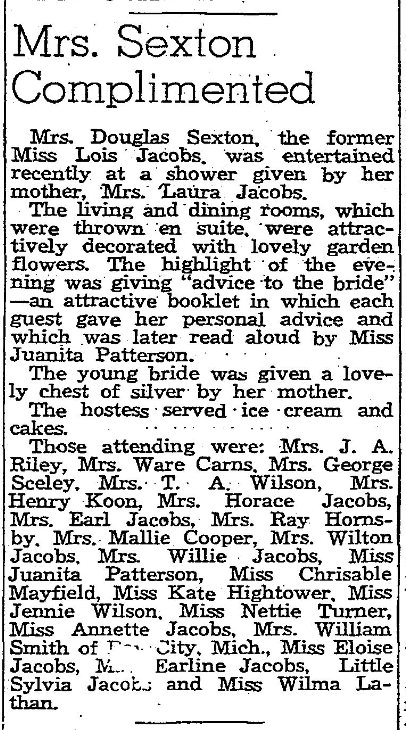 Those attending were: Mrs. J. A. Riley, Mrs. Ware Carns, Mrs. George Sceley, Mrs. T. A. Wilson, Mrs. Henry Koon, Mrs. Horace Jacobs, Mrs. Earl Jacobs, Mrs. Ray Hornsby, Mrs. Mallie Cooper, Mrs. Wilton Jacobs, Mrs. Willie Jacobs, Miss Juanita Paterson, Miss Chrisable Mayfield, Miss Kate Hightower, Miss Jennie Wilson, Miss Nettie Turner, Miss Annette Jacobs, Mrs. William Smith of (?) Mich., Miss Eloise Jacobs, Miss. Earline Jacobs, Little Sylvia Jacobs; and Miss Wilma Lathan.
