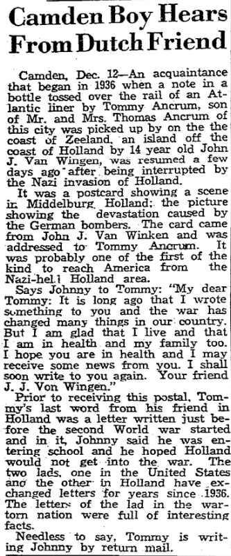 Camden, Dec. 12 – An acquaintance that began in 1936 when an Atlantic liner by Tommy Ancrum, son of Mr. and Mrs. Thomas Ancrum of this city was picked up by on the coast of Holland by 14 year old John J Van Wingen, was resumed a few days ago “after beinginterrupted by the Nazi invasion of Holland.