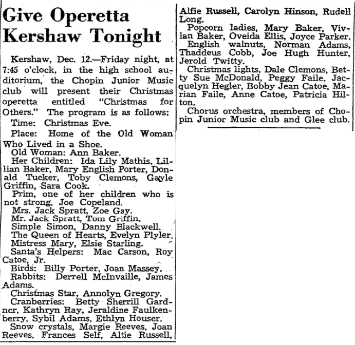 Kershaw, Dec. 12. – Friday night, at 7:45 o’clock, in the high school auditorium, the Chopin Junior Music club will present their Christmas operetta entitled “Christmas for Others.” The program is a follows: