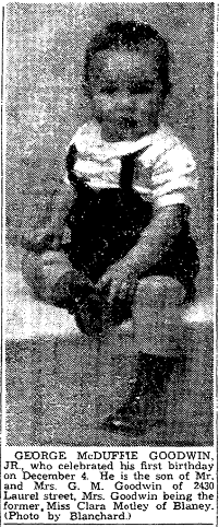 GEORGE McDUFFIE GOODWIN, JR., who celebrated his first birthday on December 4. He is the son of Mr. and Mrs. G. M. Goodwin of 2430 Laurel Street, Mrs. Goodwin being the former, Miss Clara Motley of Blaney. (Photo by Blanchard.)