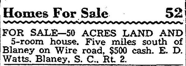 FOR SALE – 50 ACRES LAND AND 5-room house. Five miles south of Blaney on Wire road, $500 cash. E. D. Watts. Blaney, S. C., Rt. 2.