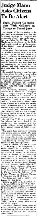 An appeal to the citizenship to be alert and to co-operate with law enforcement agencies in “keeping this community clean” was made yesterday by Judge M. M. Mann of St. Matthews in his charge to the Richland county grand jury at the opening of the January term of general sessions court.