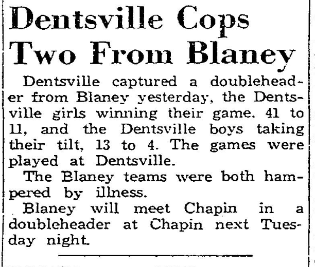 Dentsville captured a doubleheader from Blaney yesterday, the Dentsville girls winning their game, 41 to 11, and the Dentsville boys taking their tilt, 13 to 4. The games were played at Dentsville.