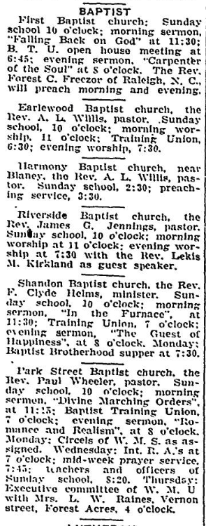 Shandon Baptist Church, the Rev. F. Clyde Helms, minister, Sunday school, 10 o’clock; morning sermon, “In the Furnace”, at 11:30; Training Union, 7 o’clock; evening sermon, “The Guest of Happiness”, at 8 o’clock. Monday Baptist brotherhood supper at 7:30.