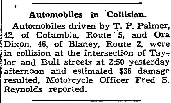 Automobiles driven by T. P. Palmer, 42, of Columbia, Route 5, and Ora Dixon, 46, of Blaney, Route 2, were in collision at the intersection of Taylor and Bull streets at 2:50 yesterday afternoon and estimated $36 damage resulted, Motorcycle Officer Fred S. Reynolds reported.