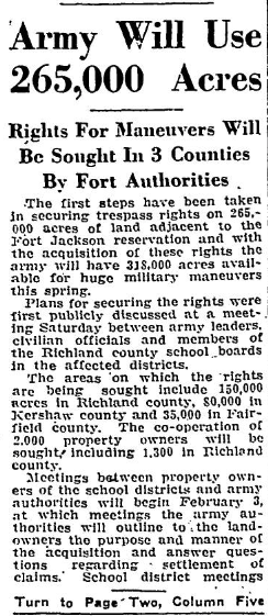 The first steps have been taken in securing interest trespass rights on 265,000 acres of land adjacent to the Fort Jackson reservation and the acquisition of these rights the army will have 318,000 acres available for huge military maneuvers this spring.