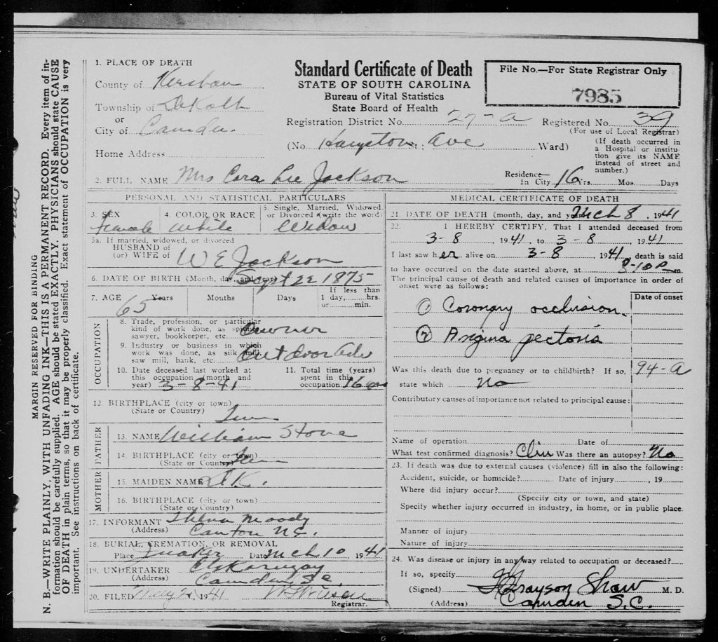 She died on 08 Mar 1941 in Camden, Kershaw, South Carolina, USA on Hampton ave. She was buried on 10 Mar 1941 in Camden, Kershaw, South Carolina, USA at Quaker Cemetery. Her cause of death was coronary occlusion and angina pectoris.