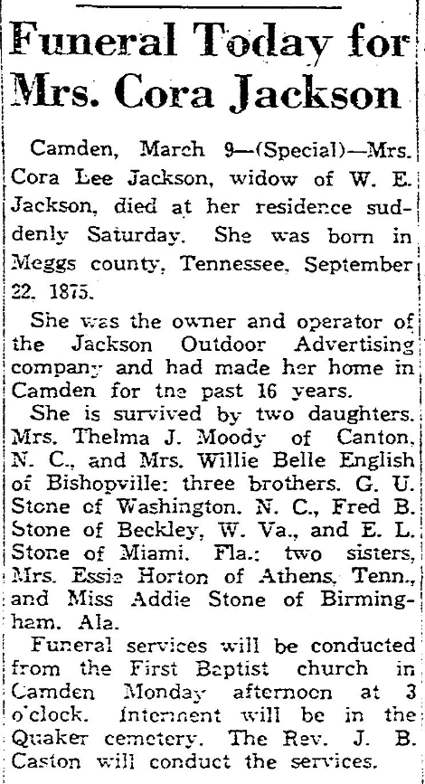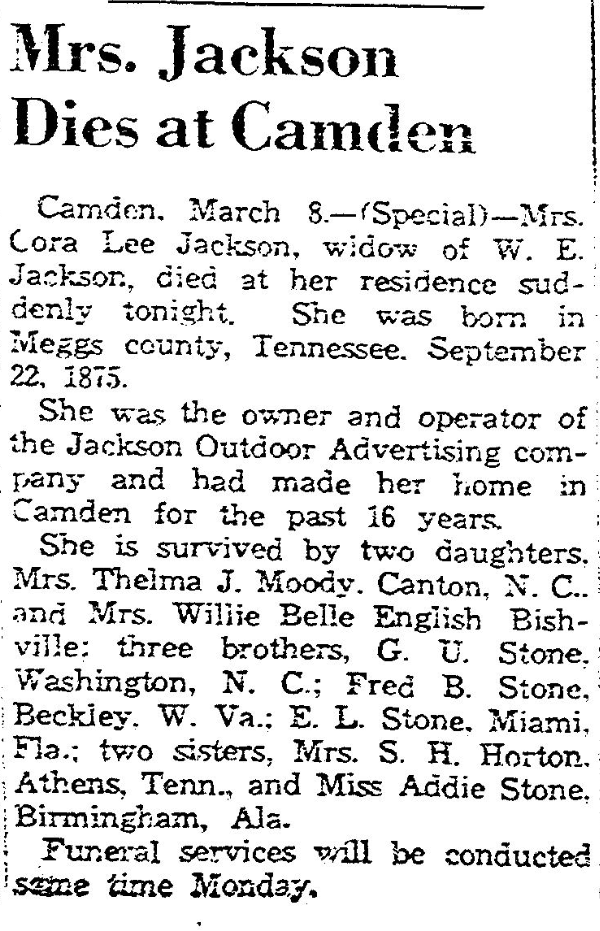 Camden, March 9-(Special)-Mrs.Cora Lee Jackson, widow of W. E. Jackson, died at her residence suddenly Saturday. She was born in Meggs county: Tennessee, September 22, 1875.