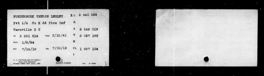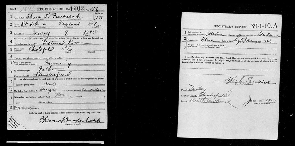 Theron L Funderburk completed his United States World War I Draft Registration Card on June 5, 1917 in Chesterfield, South Carolina, USA, as a 23-year-old, single, white, having been born on January 9, 1894 as a natural born citizen in Chesterfield, South Carolina, USA. His current address was RFD #2, Pageland, South Carolina, where he was a farmer. He was described as medium height, medium built, blue eyes and light brown hair with no balding.