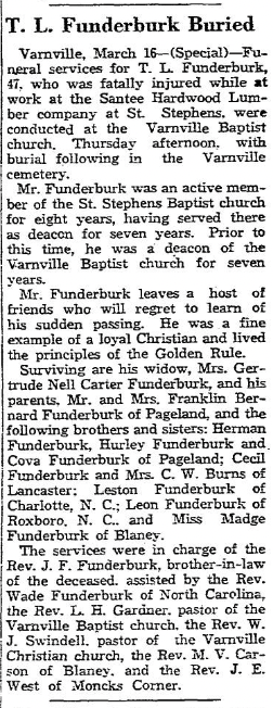Varnville, March 16 – (Special) – Funeral services for T. L. Funderburk, 47, who was fatally injured while at work at the Santee Hardwood Lumber company at St. Stephens, were conducted at the Varnville Baptist church, Thursday afternoon, with burial following in the Varnville cemetery.