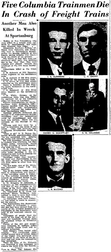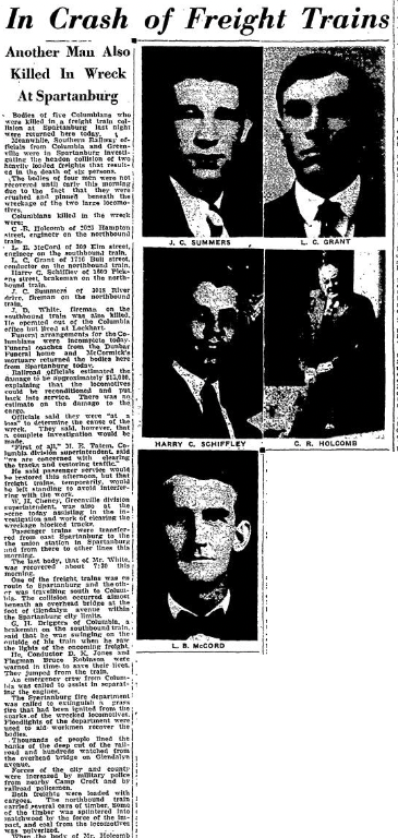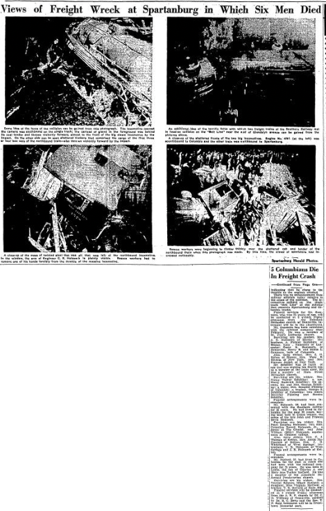 Meanwhile, Southern Railway officials from Columbia and Greenville were in Spartanburg investigating the headon collision of two heavily loaded freights that resulted in the death of six persons.