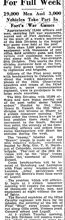 The 30th Division with 19,000 officer and men began moving out of the post today under “sealed orders” Headed by Maj. Gen. Henry D. Russell, the 30th “Blue” division will bivouac at Blaney by 3 o’clock tomorrow morning. The only order the troops have is to get into position there ready for a movement to the South. Beyond that point, the strategy of the commanding officer and orders from the corps headquarter will direct the exercises during the week.