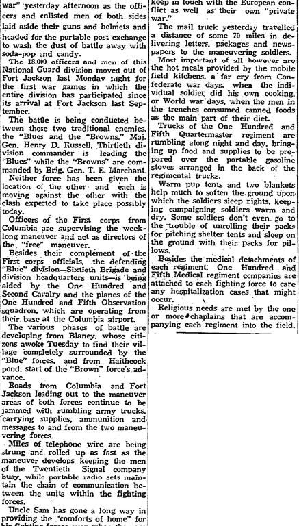 Road from Columbia and Fort Jackson leading out to the maneuver area of both forces continue to be jammed with rumbling army trucks, carrying supplies, ammunition and messages to and from the two maneuvering forces.