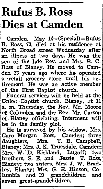He is survied by his widow, Mrs. Cora Morgan Ross, Camden; Three daughters, Mrs. T. B. Campbell, Blaney, Mrs. J. K. Truesdale, Camden; Mrs. W. D. Kirkland, Lugoff; two brothers, S. E. Ross and Jessie T. Ross, Blaney; two sisters, Mrs. J. W. Bradley, Blaney; Mrs. G. E. Hinson, Columbia and 20 grandchildren and seven great-grandchildren.