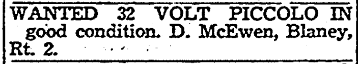 Today in HistoryWanted 32 Volt Piccolo In Wanted 32 Volt Piccolo In good condition. D. McEwen, Blaney, Rt. 2. June 3, 1941 State (published as The State) Columbia, South CarolinaPage 10