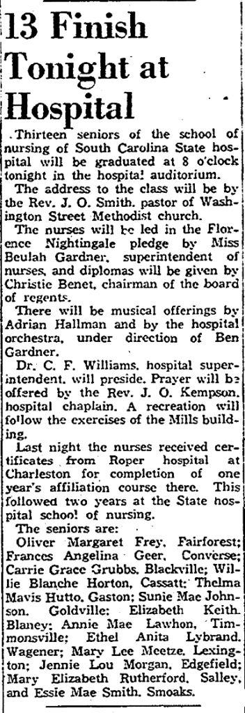 Oliver Margaret Frey, Fairforest; Frances Angelina Geer, Converse; Carrie Grace Grubbs, Blackville; Willie Blanche Horton, Cassatt; Thelma Mavis Hutto, Gaston; Sunie Mac Johnson, Goldville; Elizabeth Keith, Blaney; Annie Mae Lawhon, Timmonsville; Ethel Anita Lybrand, Wagner; Mary Lee Meetze, Lexington; Jeannie Lou Morgan, Edgefield; Mary Elizabeth Rutherford, Salley, and Essie Mae Smith, Smoaks.