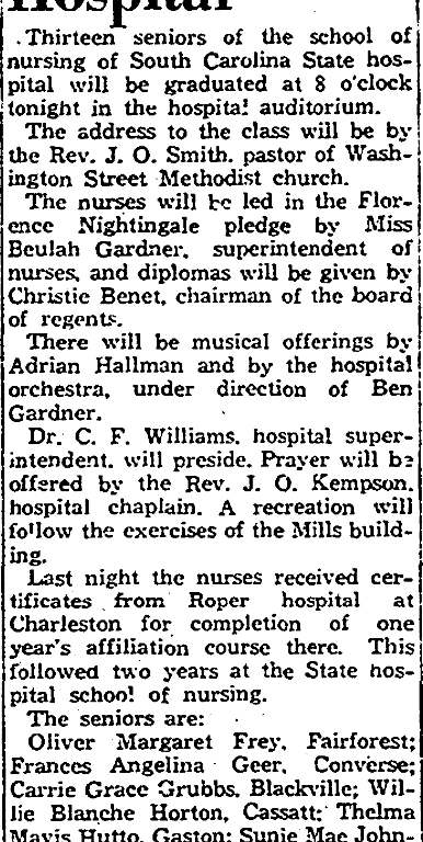Last night the nurses received certificates from Roper hospital at Charleston for completion of one year’s affiliation course there. This follow two years at the State hospital school of nursing.
