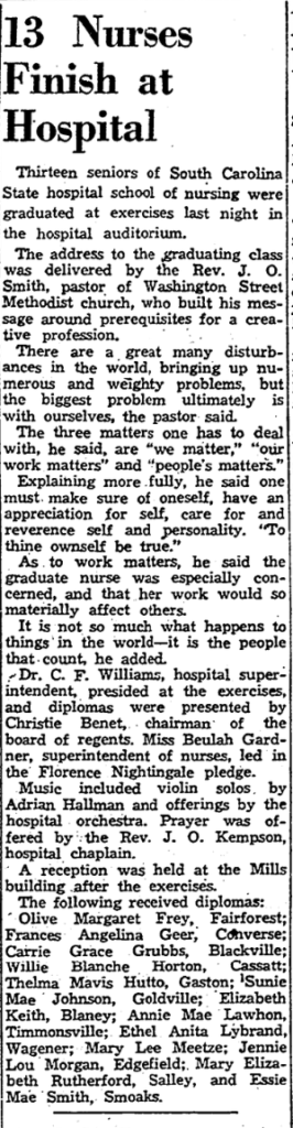 Oliver Margaret Frey, Fairforest; Frances Angelina Geer, Converse; Carrie Grace Grubbs, Blackville; Willie Blanche Horton, Cassatt; Thelma Mavis Hutto, Gaston; Sunie Mac Johnson, Goldville; Elizabeth Keith, Blaney; Annie Mae Lawhon, Timmonsville; Ethel Anita Lybrand, Wagner; Mary Lee Meetze, Lexington; Jeannie Lou Morgan, Edgefield; Mary Elizabeth Rutherford, Salley, and Essie Mae Smith, Smoaks.