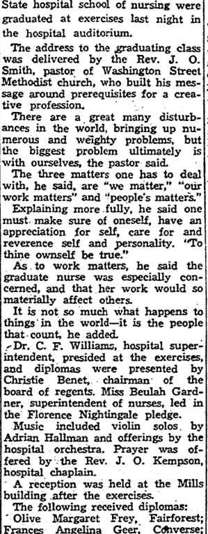 Dr. C. F. Williams, hospital superintendent, presided at the exercises, and diplomas were presented by Christie Benet, chairman of the board of regents. Miss Beulah Gardener, superintendent of nurses, led in the Florence Nightingale pledge.