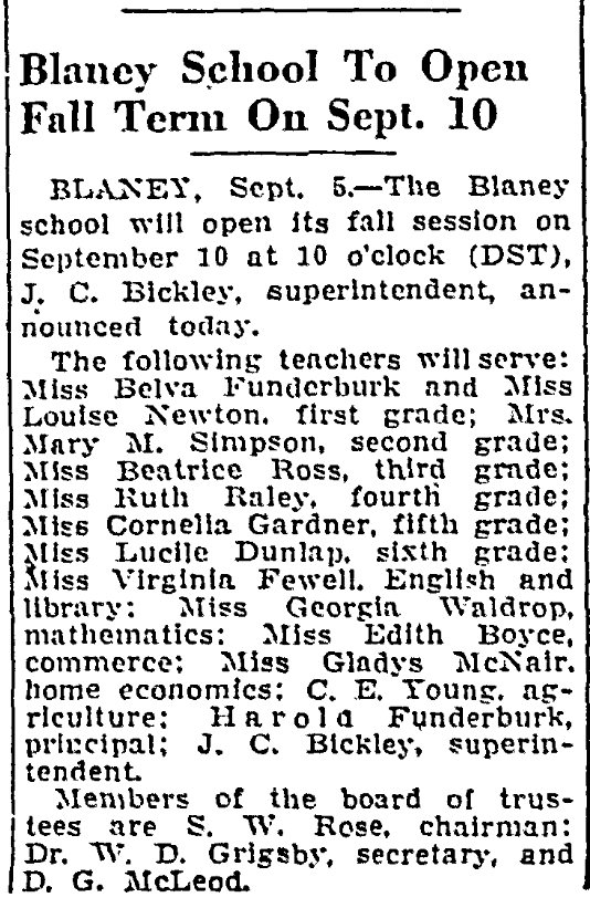 BLANEY, Sept. 5. – The Blaney school will open its fall session on September 10 at 10 o’clock (DST), J. C. Bickley, superintendent, announced today.