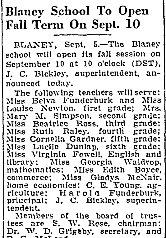 The following teachers will serve: Miss Belva Funderburk and Miss Louise Newton, first grade; Mrs. Mary M. Simpson, second grade; Miss Beatrice Ross, third grade; Miss Ruth Raley, fourth grade; Miss Cornelia Gardner, fifth grade; Miss Lucile Dunlap, sixth grade; Miss Virginia Fewell, English and library; Miss Georgia Waldrop, mathematics; Miss Edith Boyce, commerce; Miss Gladys McNair, home economics; C. E. Young, agriculture; Harold Funderburk, principal; J. C. Bickley, superintendent.