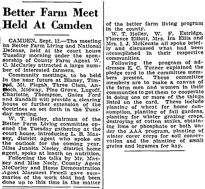 CAMDEN, Sept. 12. – The meeting on Better Farm Living and National Defense, held at the court house Tuesday morning under the sponsorship of County Farm Agent W. C. McCarley attracted a large number of interested farmers.