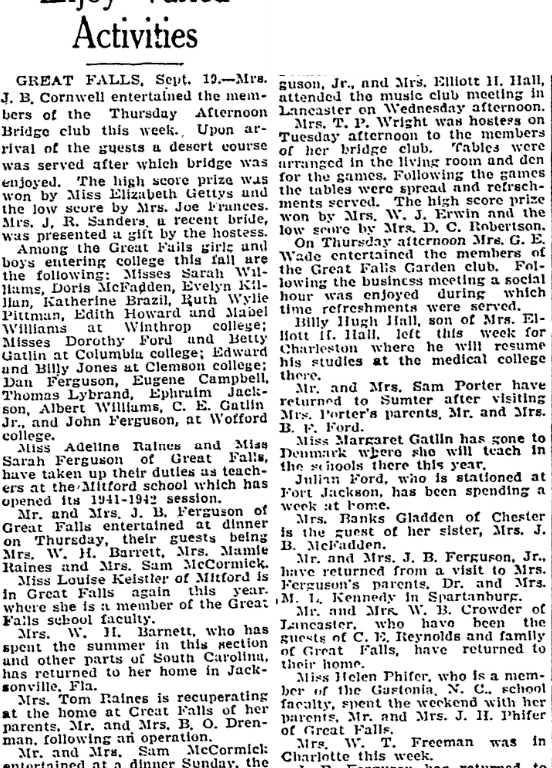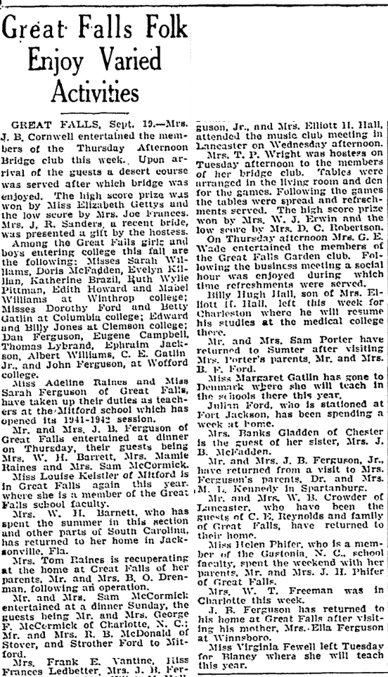 Among the Great Falls girls and boys entering college this fall are the following: Mrs. Sarah Williams, Doris McFadden, Evelyn Killian, Katherine Brazil, Ruth Wylie Pittman, Edith Howard and Maybel Williams at Winthrop college; Mrs. Dorothy Ford and Betty Gatlin at Columbia college; Edward Jones and Billy Jones at Clemson college; Dan Ferguson, Eugene Campbell, Thomas Lybrand, Ephraim Jackson, Albert Williams, C. E. Gatlin, Jr., and John Ferguson, at Wofford college.