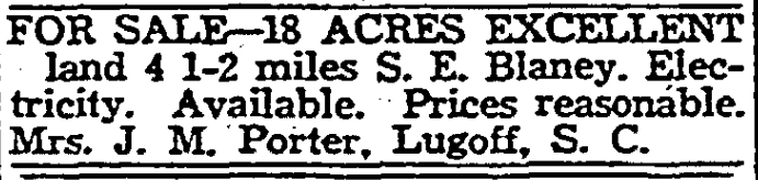 FOR SALE – 18 ACRES EXCELLENT land 4 1-2 miles S. E. Blaney. Electricity. Available. Prices reasonable. Mrs. J. M. Porter, Lugoff, S. C.