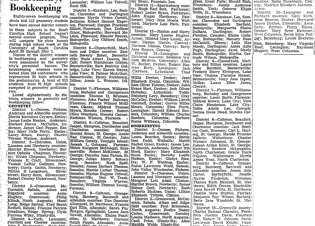 Eighty-seven bookkeeping students and 112 geometry students have been named district winners in these subjects in the South Carolina High School league’s mental contest program. they will compete for state honors during high school week at the Univeristy of South Carolina April 29, through May 1.