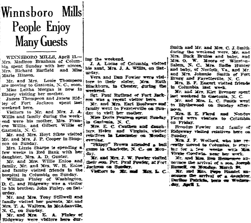 WINNSBORO MILLS, April 11. – Mrs Madison Branham of Columbia spent Sunday with her nieces, Mrs. Richard Barfield and Miss Marie Hinson. Mr. and Mrs. Louie Thompson are moving to Gastonia, N. C., Soon. Miss Leitha Morgan is now in Blaney visiting her mother. James Thompson and James Ridley of Fort Jackson spent last weekend here. Visitors to Mr. and Mrs. J. A. Willis and … Continue reading Winnsboro Mills People Enjoy Many Guest