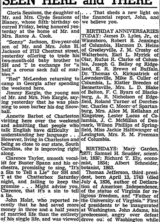Gloria Sessions, the daughter of Mr. and Mrs. Clyde Sessions of Blaney, whose fifth birthday occurred Friday, being honored yesterday at the home of Mr. and Mrs. Rance A. Cook. “Sonny” Jackson, five-year-old son of Mr. and Mrs. John H Jackson of 2712 Chestnut street, yesterday offering to trade his two-month-old baby brother to SH and T in exchange for “a half a crocus sack … Continue reading Seen Here and There