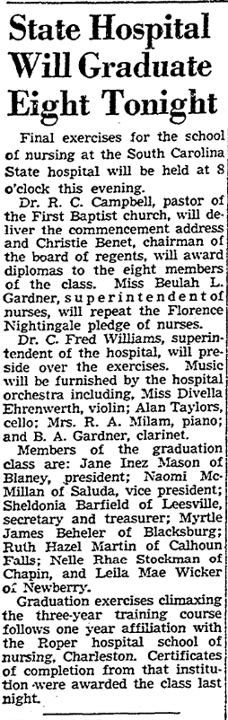 Members of the graduation class are: Jane Inez Mason, of Blaney, class president; Naomi McMillan, of Saluda, vice president; Sheldonia Barfield, of Leesville, secretary and treasurer; Myrtle James Beheler, of Blacksburg; Ruth Hazel Martin, of Calhoun Falls; Nelle Rhae Stockman, of Chapin, and Leila Mae Wicker, of Newberry.
