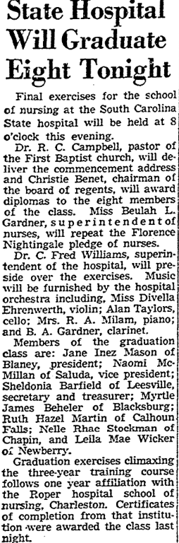 Members of the graduation class are: Jane Inez Mason, of Blaney, class president; Naomi McMillan, of Saluda, vice president; Sheldonia Barfield, of Leesville, secretary and treasurer; Myrtle James Beheler, of Blacksburg; Ruth Hazel Martin, of Calhoun Falls; Nelle Rhae Stockman, of Chapin, and Leila Mae Wicker, of Newberry.