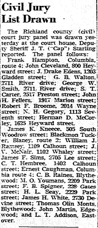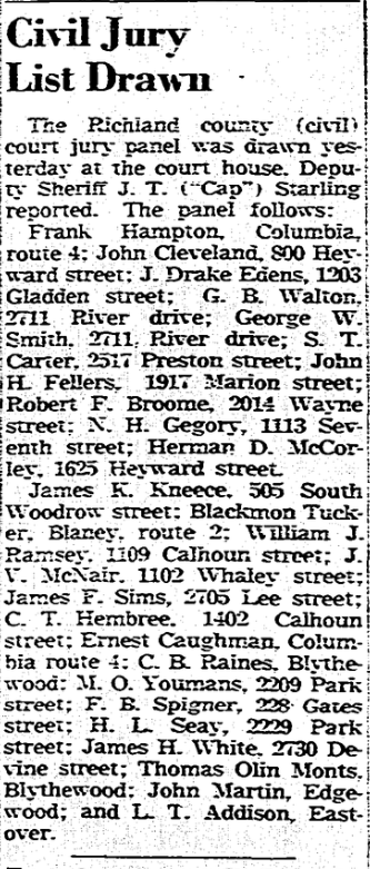 James K. Kneece, 505 South Woodrow street; Blackmon Tucker, Blaney, route 2; William J. Ramsey, 1109 Calhoun street; J. V. McNair, 1102 Whaley street; James F. Sims, 2705 Lee street; C. T. Hembree, 1402 Calhoun street; Ernest Caughman, Columbia route 4; C. B. Raines, Blythewood; M. O. Youmans, 2209 Park Street; F. B. Spigner, 228 Gate street; H. L. Seay, 2229 Park street; James H. White, 2730 Devine street; Thomas Olin Monts, Blythewood; John Martin, Edgewood; and L. T. Addison, Eastover.