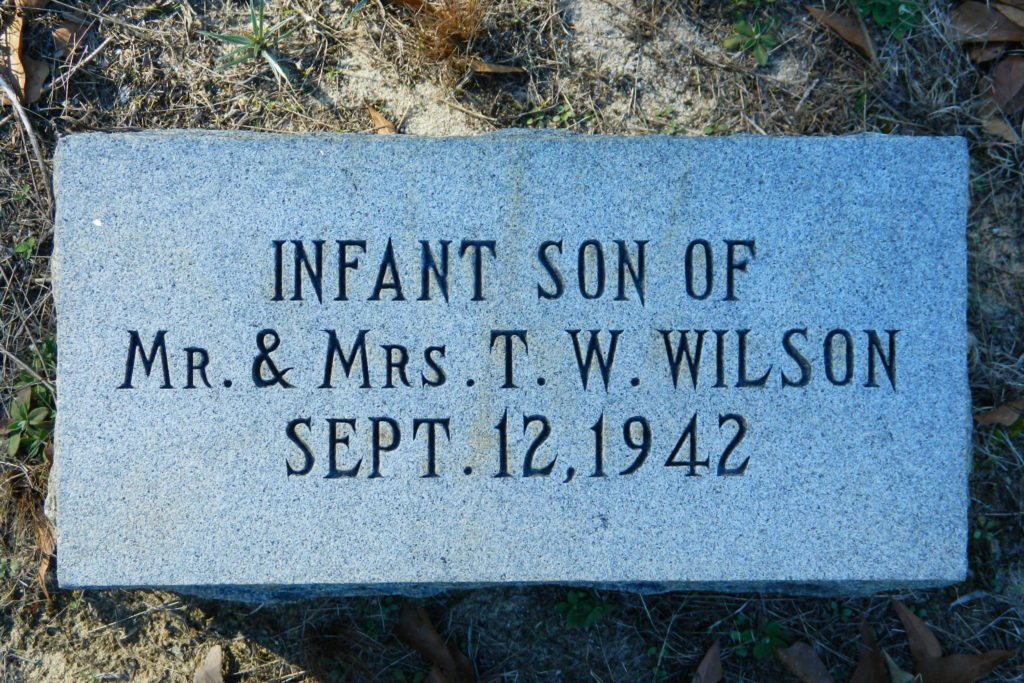 The infant son of Mr. and Mrs. T. W. Wilson was born and died on September 12, 1942. He was buried at Smyrna United Methodist Church Cemetery in Elgin, Kershaw County, South Carolina, USA