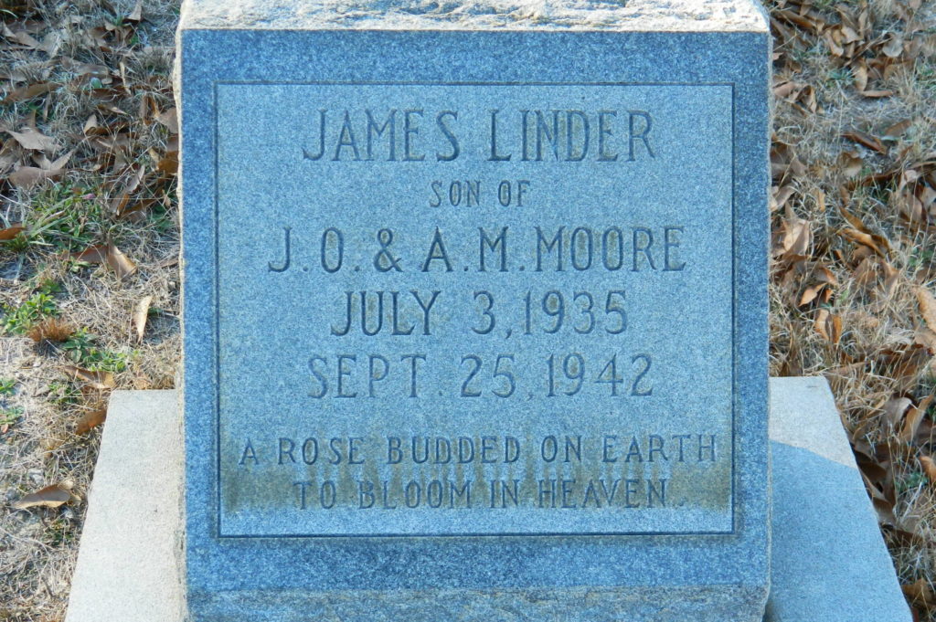 James Linder Moore, 7, passed away on September 25, 1942. He was buried at Smyrna United Methodist Church Cemetery in Elgin, Kershaw County, South Carolina.