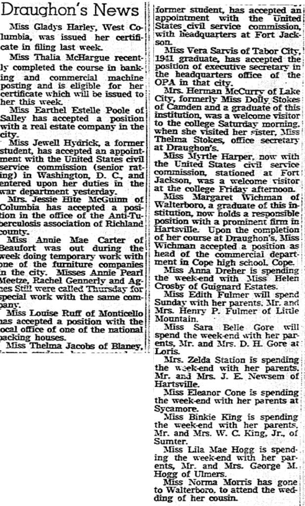 Miss Margaret Wichman of Walterboro, a graduate of this institution, now holds a responsible position with a prominent firm in Hartsville. Upon the completion of her course at Draughon’s. Miss Wichman accepted a position as head of the commercial department in Cope high school, Cope.