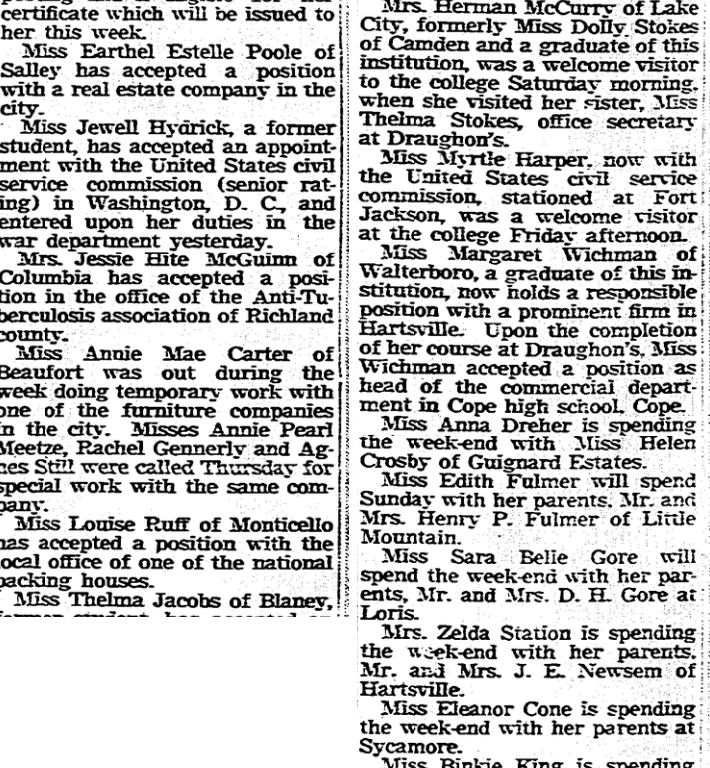 Miss Annie Mae Carter of Beaufort was out during the week doing temporary work with one of the furniture companies in the city. Misses Annie Pearl Meetze, Rachel Gennerly and Agness Still were called Thursday for special work with the same company.