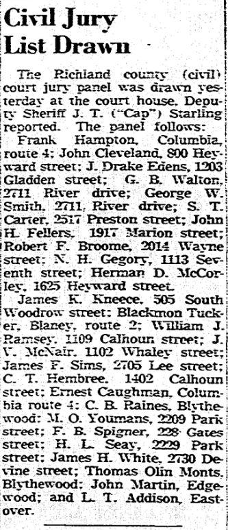 The Richland county (civil) court jury panel was drawn yesterday at the courthouse. Deputy Sheriff J. T. (“Cap”) Starling reported. The panel follows: Frank Hampton, Columbia, route 4; John Cleveland, 800 Heyward street; G. B. Walton, 2711 River driver; S. T. Carter, 2517 Preston street; John H. Fellers, 1917 Marion street; Robert F. Broome, 2014 Wayne Street; N. H. Gegory, 1113 Seventh street; Herman D. … Continue reading Civil Jury List Drawn