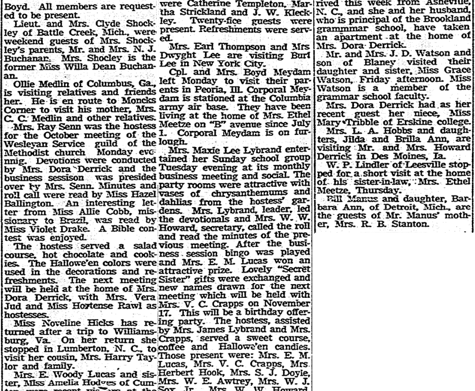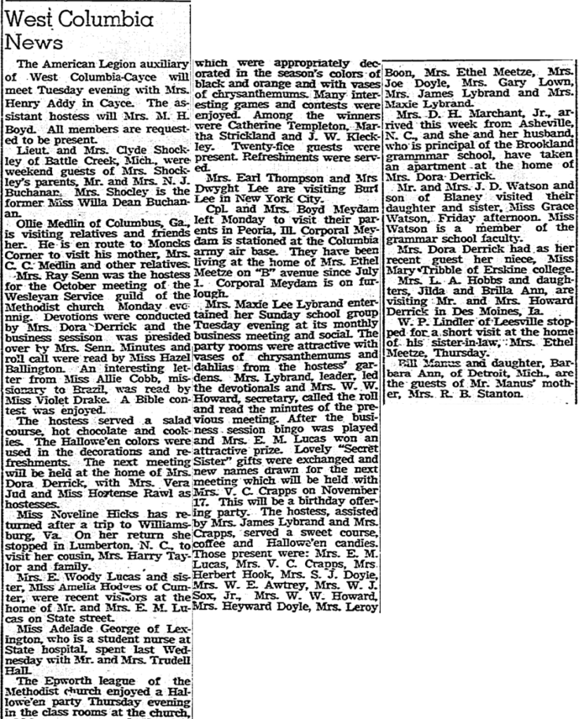 Mrs. Maxie Lee Lybrand entertained her Sunday school group Tuesday evening at its monthly business meeting and social. The party rooms were attractive with vases of chrysanthemums and dahlias from the hostess’ gardens. Mrs. Lybrand, leader, led the devotionals and Mrs. W. W. Howard, secretary, called the roll and read the minutes of the previous meeting. After the business session bingo was played and Mrs. E. M. won an attractive prize. Lovely “Secret Sister” gifts were exchanged and new names drawn for the next meeting which will be held with Mrs. V. C. Crapps on November 17. This will be a birthday offering part. The hostess, assisted by Mrs. James Lybrand and Mrs. Crapps, served a sweet course, coffee and Halloween candies. Those present were: Mrs. E. M. Lucas, Mrs. V. C. Crapps, Mrs. Herbert Hook, Mrs. S. J. Doyle, Mrs. W. E. Awtrey, Mrs. W. J. Sox, Jr., Mrs. W. W. Howard, Mrs. Heyward Doyle, Mrs. Leroy Boon, Mrs. Ethel Meetze, Mrs. Joe Doyle, Mrs. Gary Lown, Mrs. James Lybrand and Mrs. Maxie Lybrand.