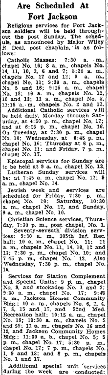Religious services for Fort Jackson Soldiers will be held throughout the post Sunday. The schedule, as announced by Major Wiley R. Deal, post chaplain, is as follows:
