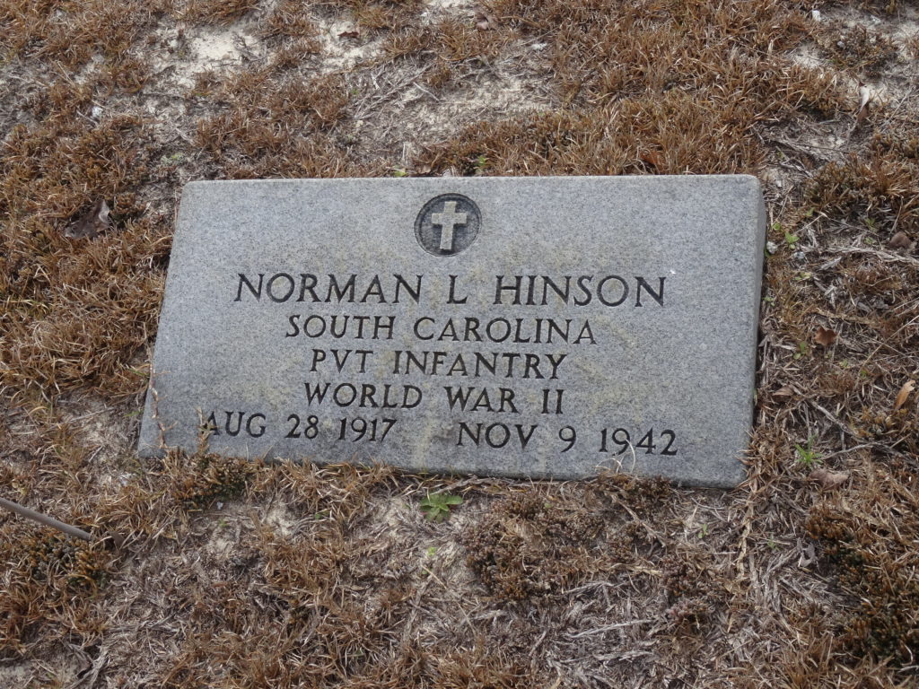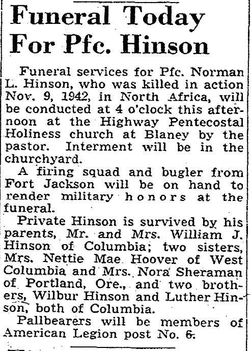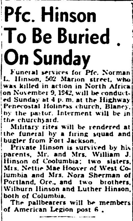 Private Hinson is survived by his parents, Mr. and Mrs. William J. Hinson of Columbia; two sisters, Mrs. Nettie Mae Hoover of West Columbia and Mrs. Nora Sherman of Portland, Ore., and two brothers, Wilburn Hinson and Luther Inson, both of Columbia.