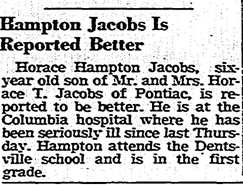 Horace Hampton Jacobs, six-year old son of Mr. and Mrs. Horace T. Jacobs (Clara Mae Kizer) of Pontiac, is reported to be better. He is at the Columbia hospital where he has been seriously ill since last Thursday. Hampton attends the Dentsville School and is the first grade.