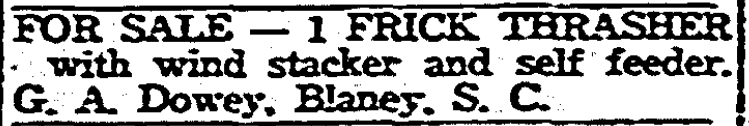 Today in HistoryFor Sale 1 Frick Thrasher For Sale 1 Frick Thrasher with wind stacker and self feeder. G. A. Dowey, Blaney, S. C. June 11, 1943 State (published as The State) Columbia, South CarolinaPage 16